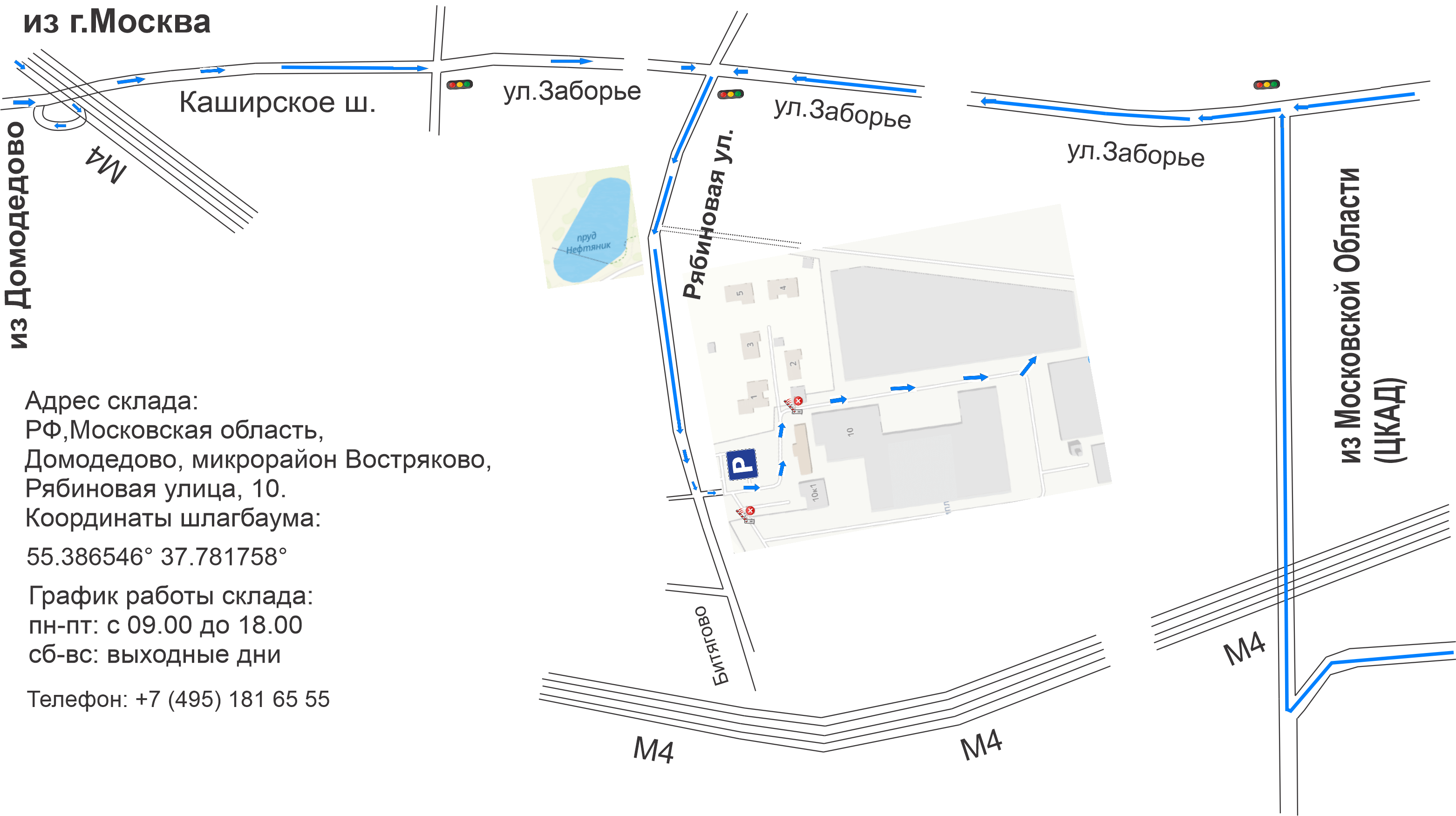 Вы можете осуществить самовывоз с нашего склада по адресу Москва, Домодедово, Востряково, Рябиновая 10, время работы с 9:00 до 18:00: